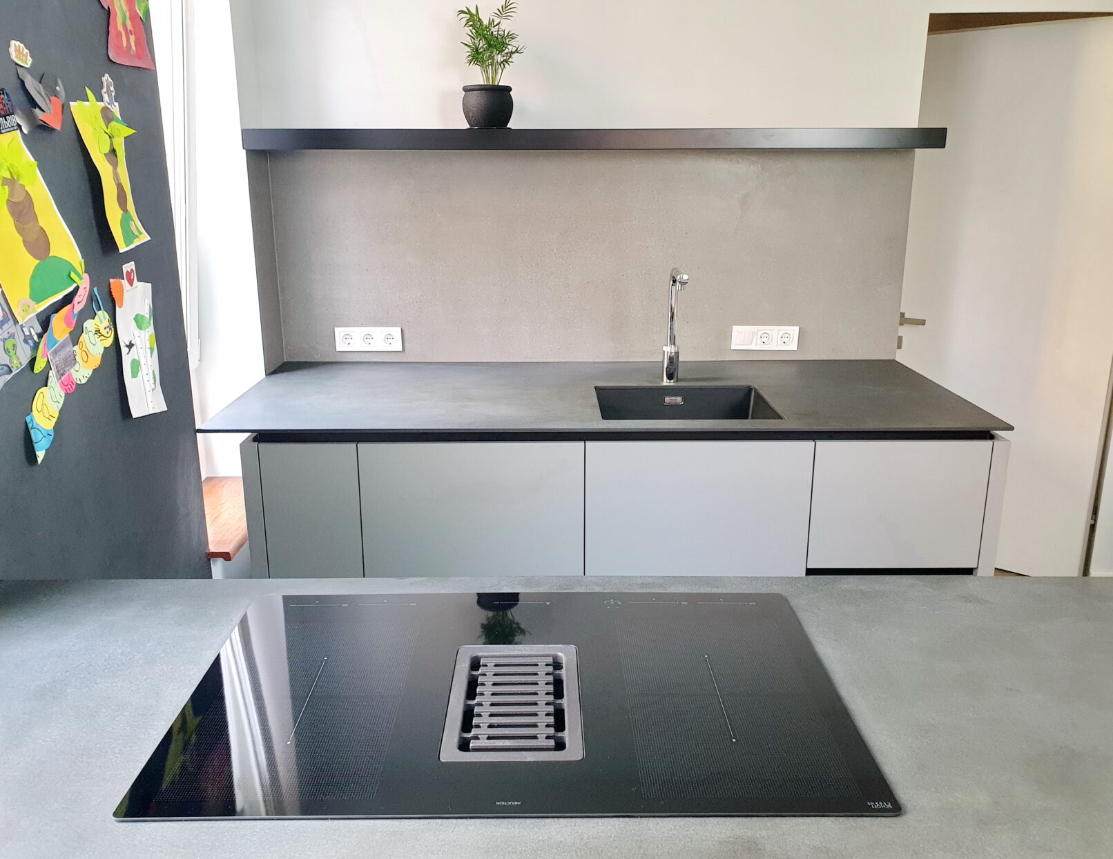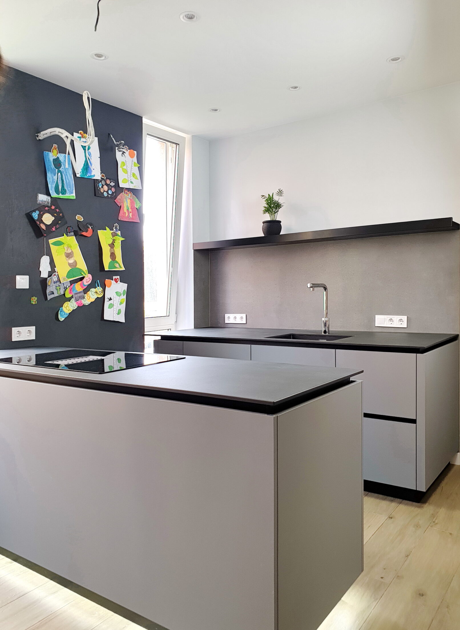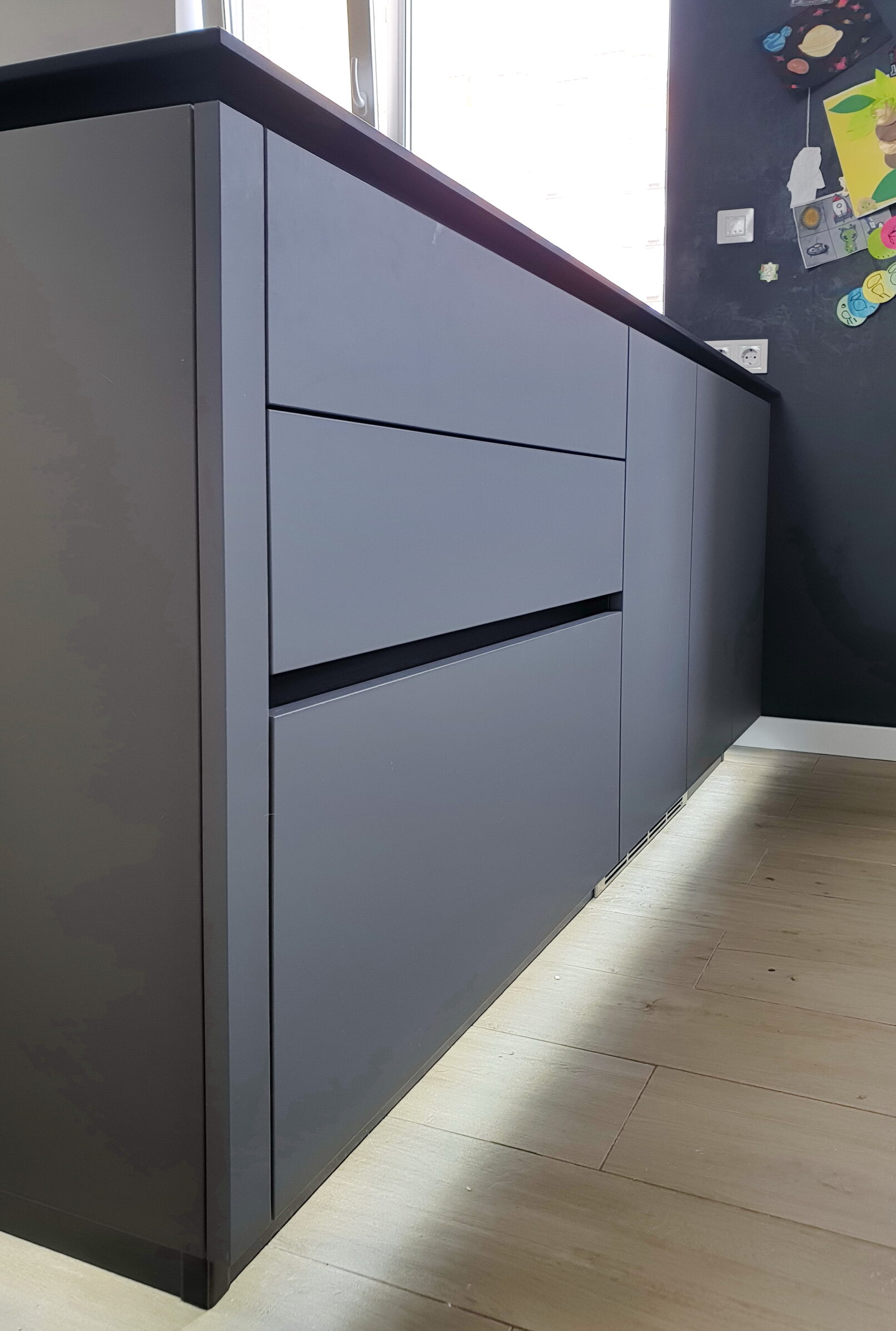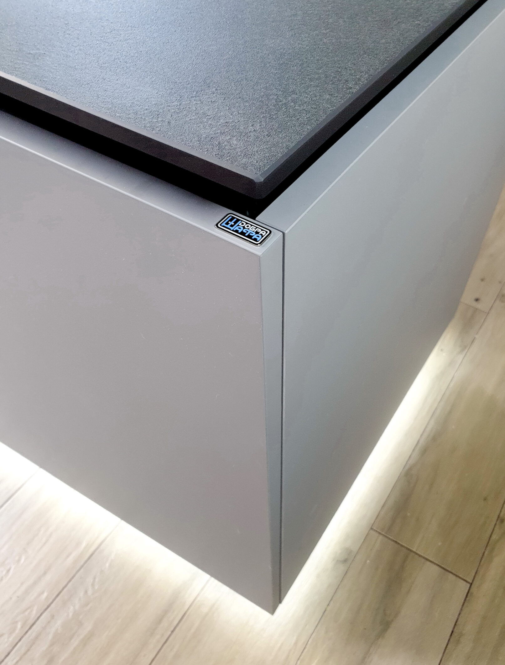 Ви втомилися від громіздких витяжок, які псують вигляд кухні? Рішення просте – варильна поверхня з витяжкою, вбудованою прямо у стільницю. Жодних зайвих деталей, тільки чистий мінімалізм. Стільниця з HPL витримує щоденні навантаження, стійка до вологи та подряпин. Кухня без верхніх секцій виглядає легкою, а острів з підсвіткою створює стильний акцент. Меблева майстерня Добра Шафа зробить для вас таку ж функціональну й сучасну кухню під індивідуальні розміри. Замовте проєкт сьогодні і отримайте простір, у якому дійсно приємно жити.