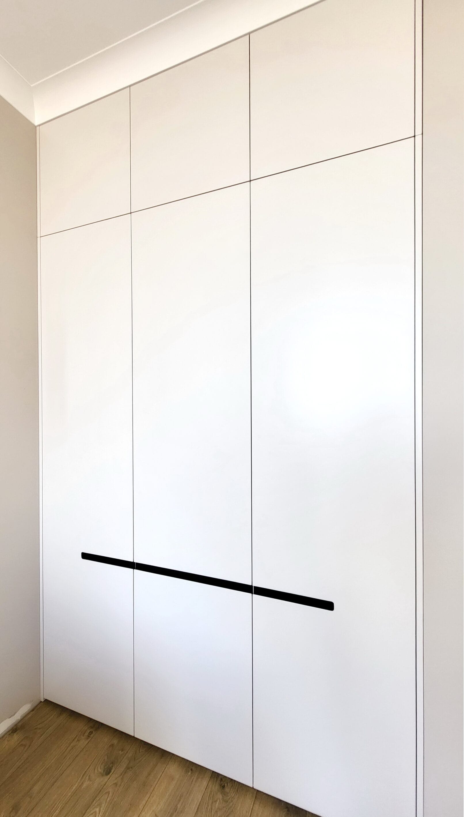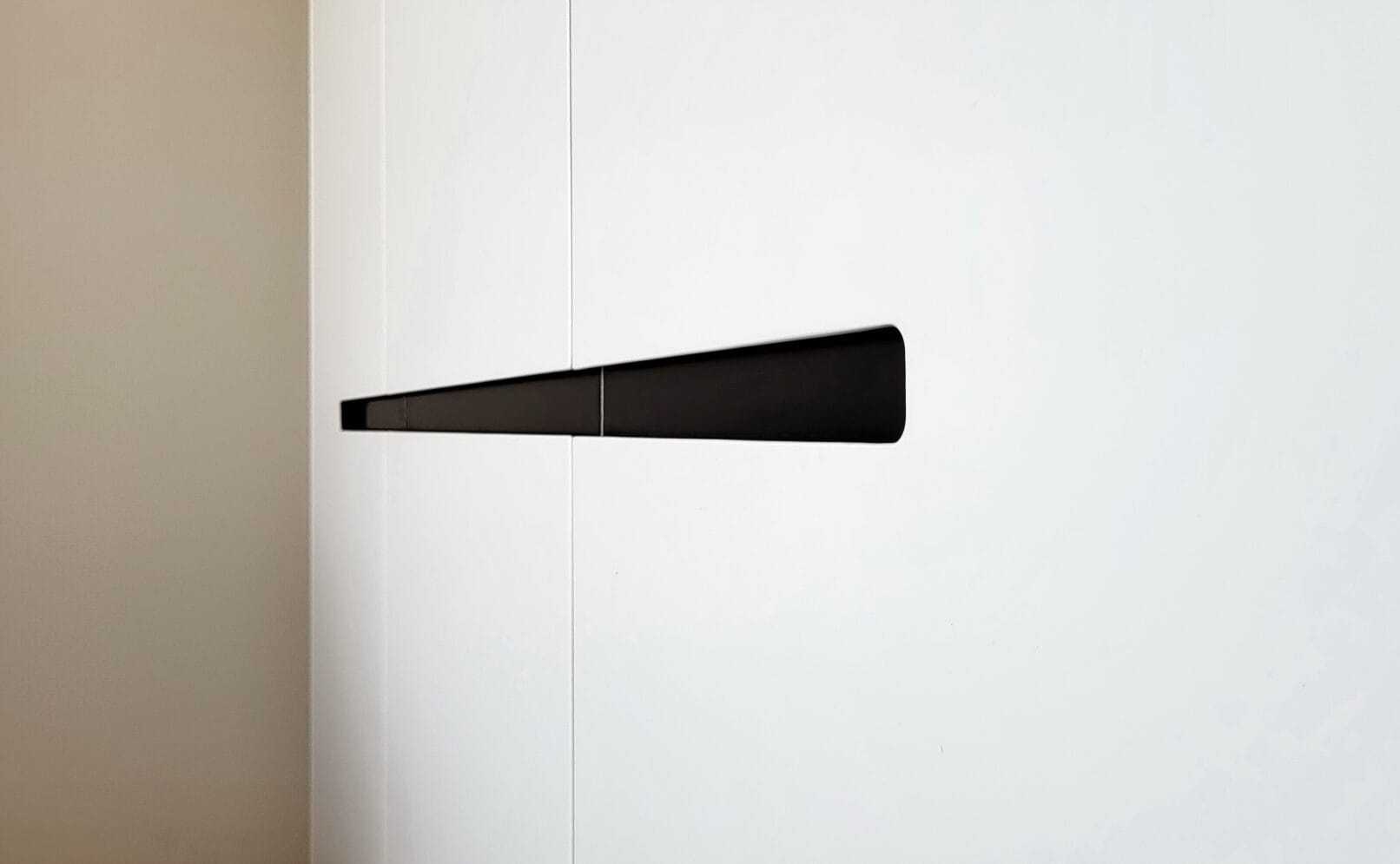 Ця вбудована шафа створена для тих, хто цінує чисті лінії та продумані пропорції. Гладкі фасади з фарбованого МДФ утворюють ідеально рівну площину без зовнішньої фурнітури. Єдиний акцент – чорна інтегрована ручка, фрезерована по всій ширині дверей. Вона надає меблям виразності, не порушуючи мінімалістичний баланс.