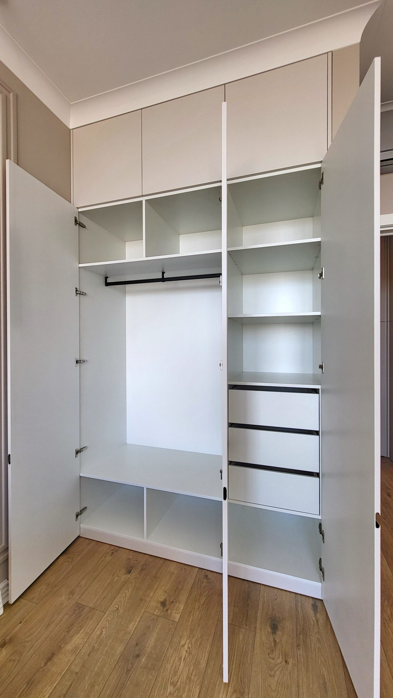 Меблева майстерня Добра Шафа розробила конструкцію до стелі, максимально використавши простір. Усередині полички, відділення для одягу та відкрита секція з перекладиною. Така шафа зливається зі стіною, залишаючи інтер’єр чистим і легким.