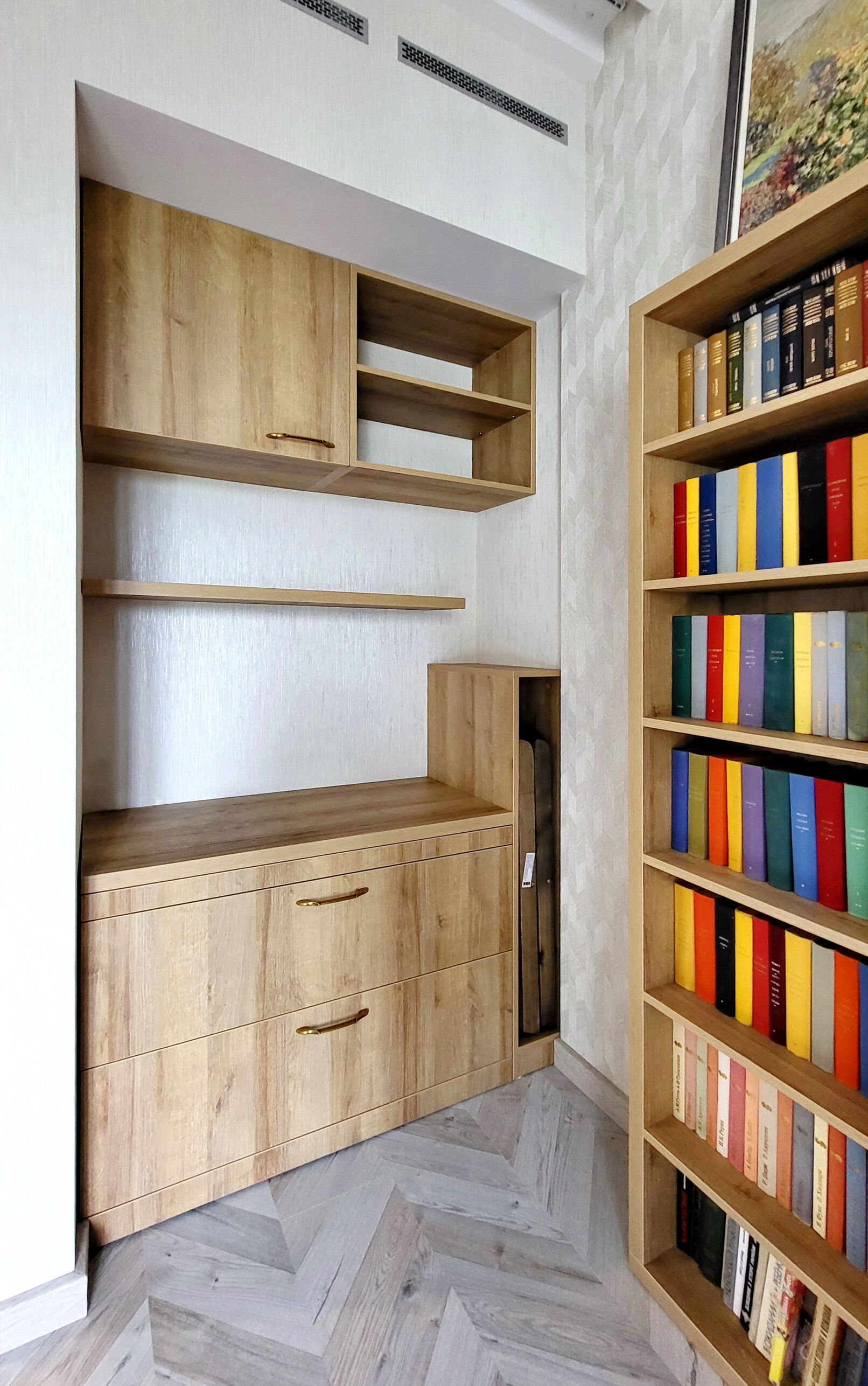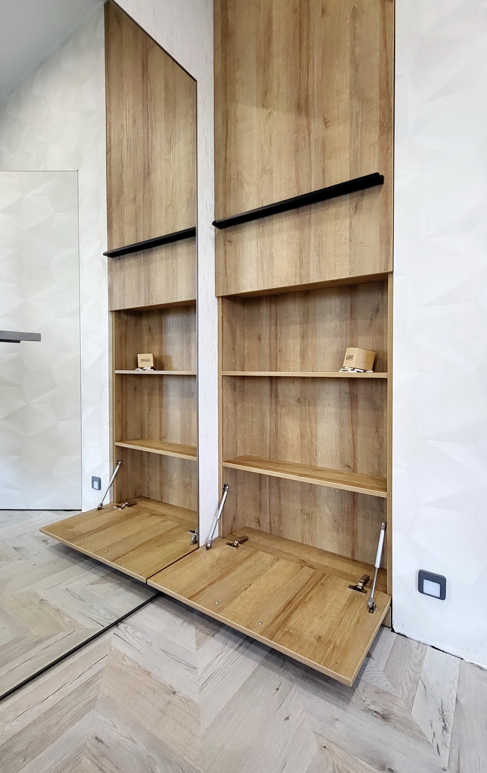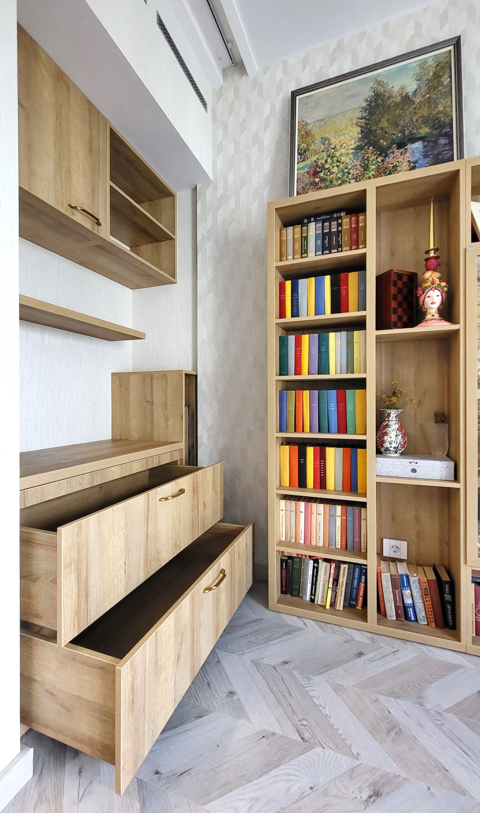 Такий підхід до організації простору цінують ті, хто працює вдома та прагне зберегти мінімалізм у кімнаті. Конструкція виготовлена з ДСП у теплих відтінках дерева, а фурнітура Blum забезпечує плавність руху.