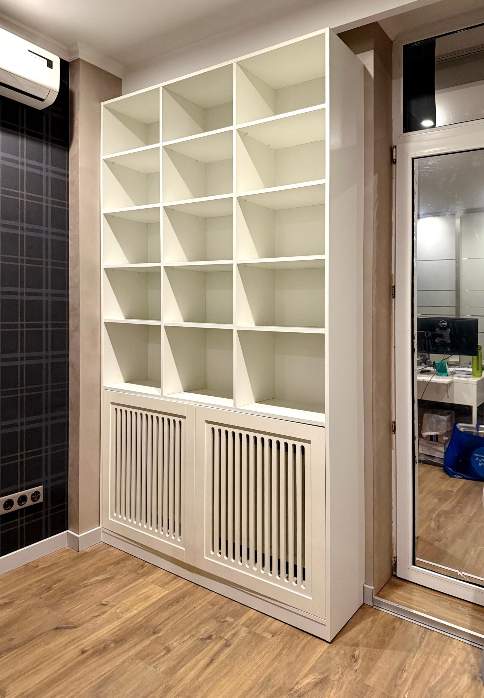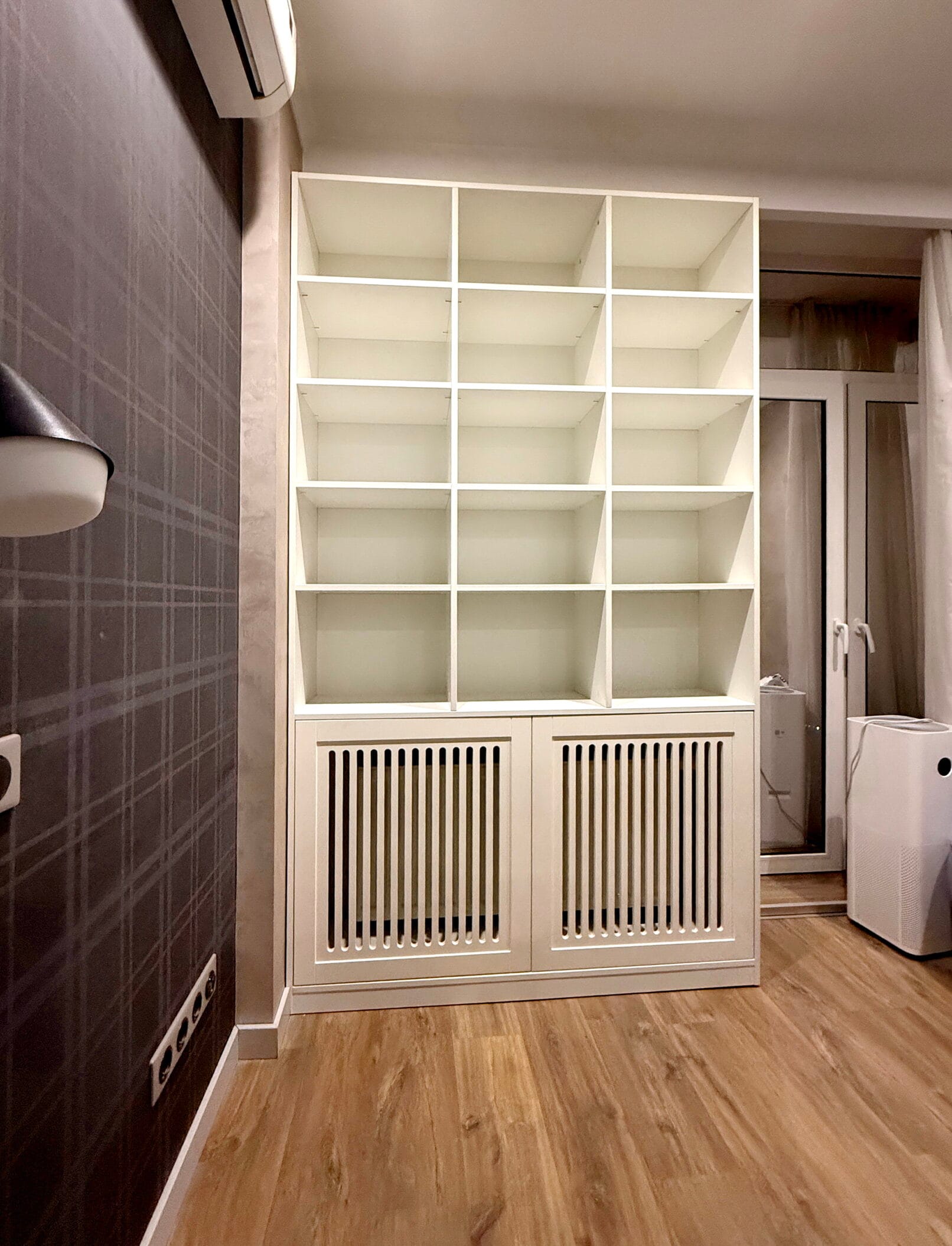 У цьому проєкті меблева майстерня Добра Шафа створила шафу з фасадами з фарбованого МДФ із фрезерованими отворами. Через них тепло вільно проходить, тож ефективність обігріву зберігається. Вентиляційні отвори зроблені точно за розміром батареї, щоб забезпечити рівномірну циркуляцію повітря.