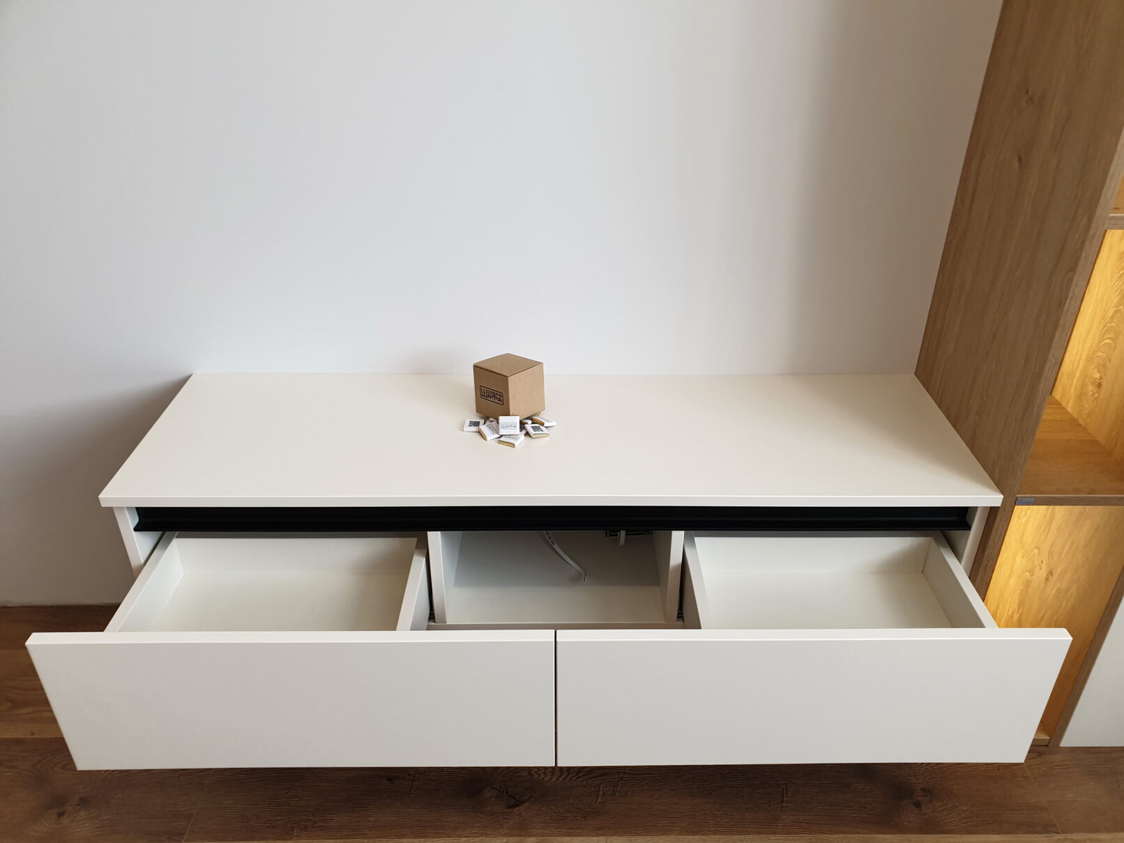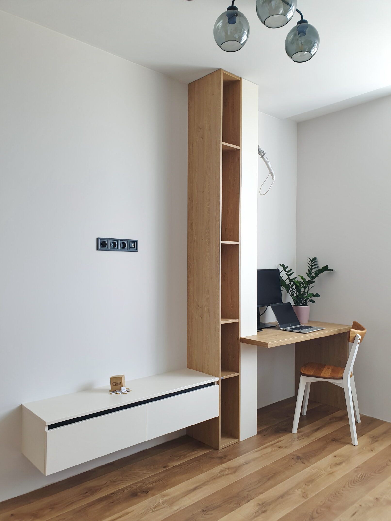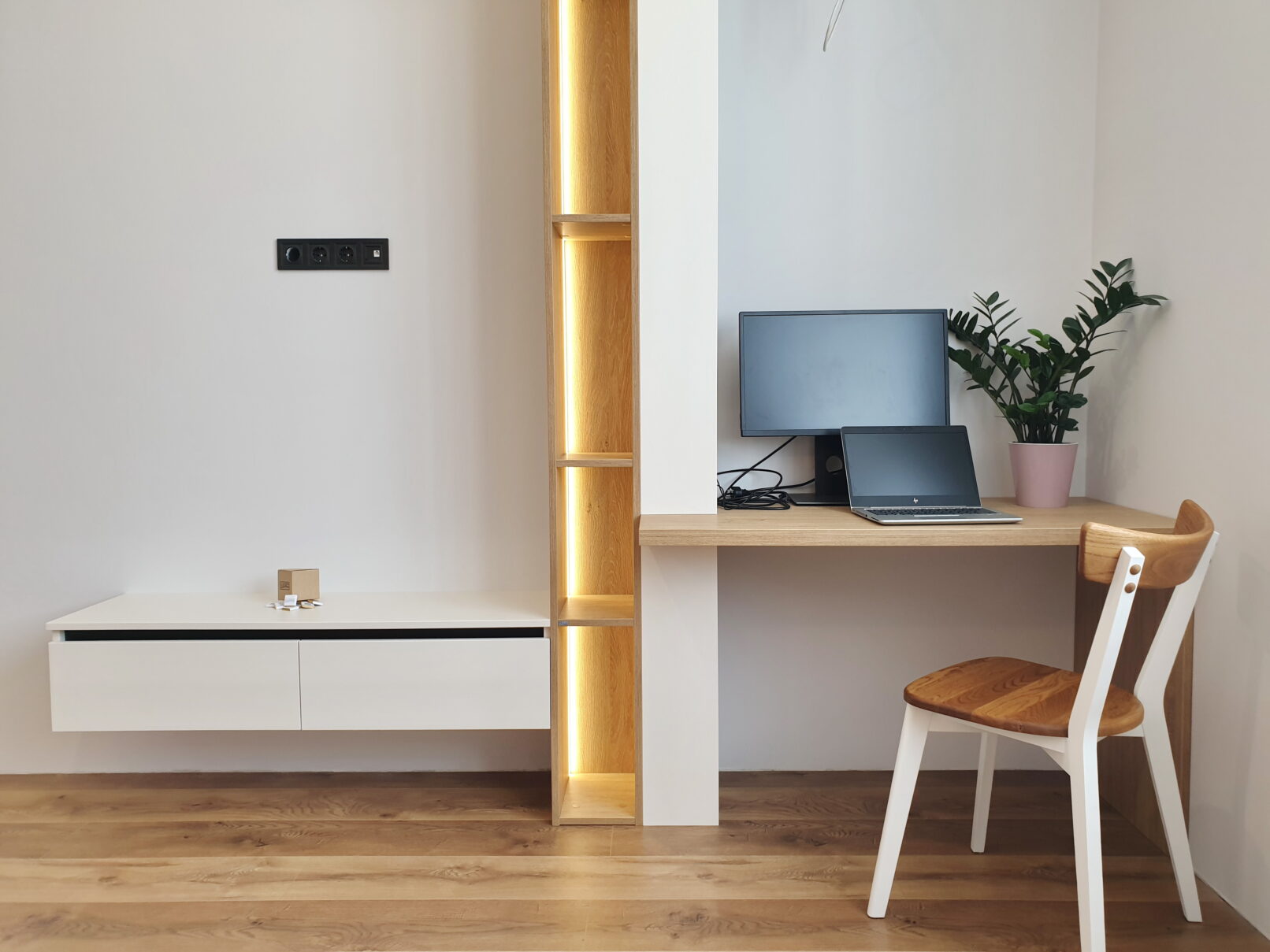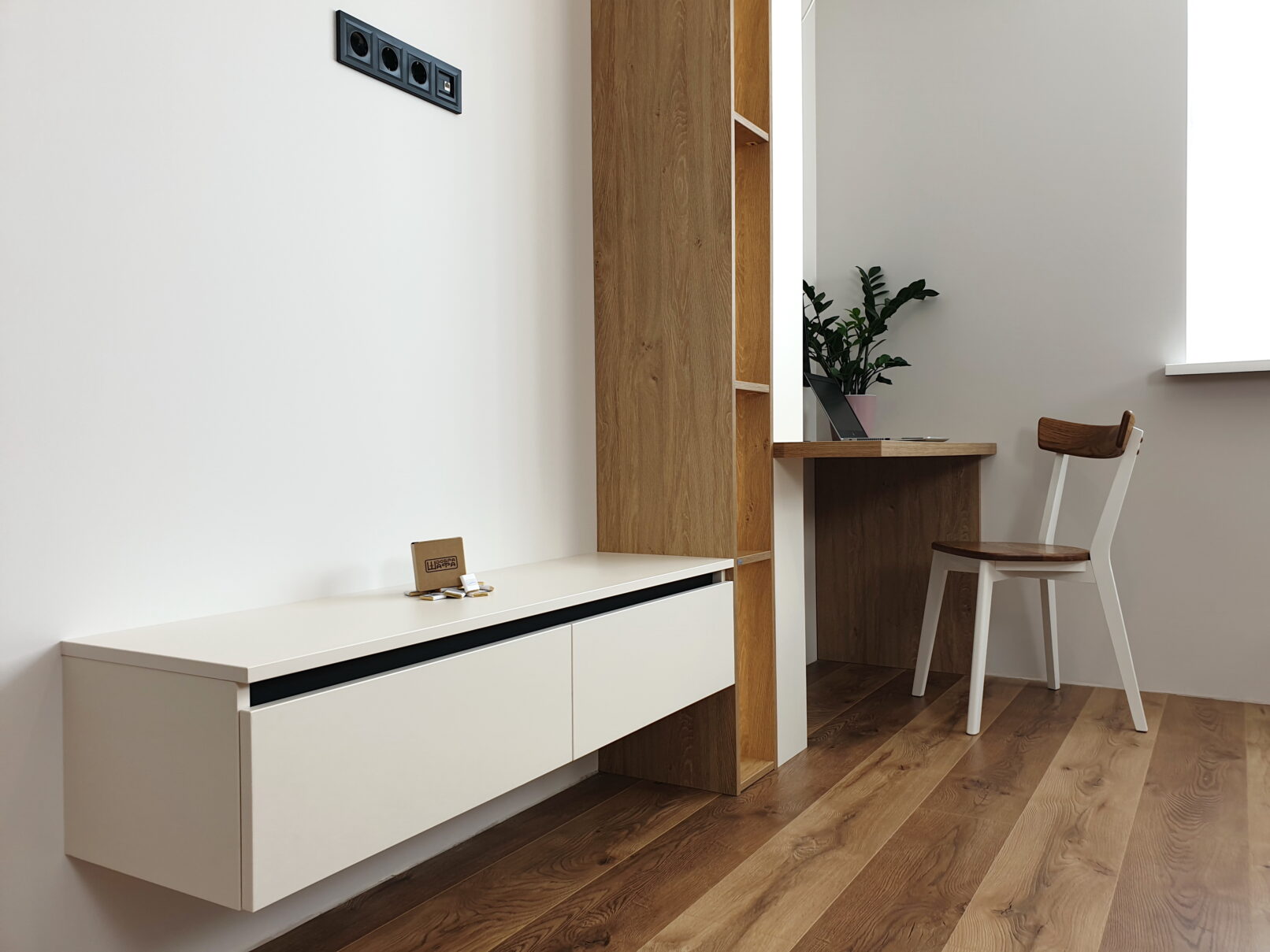 Письмовий стіл інтегровано у стелаж, що дозволяє зекономити площу без втрати функціональності. Підсвітка додає акценту й створює атмосферу. Поруч підвісна тумба з висувними шухлядами для зберігання документів, зарядок або інших дрібниць.